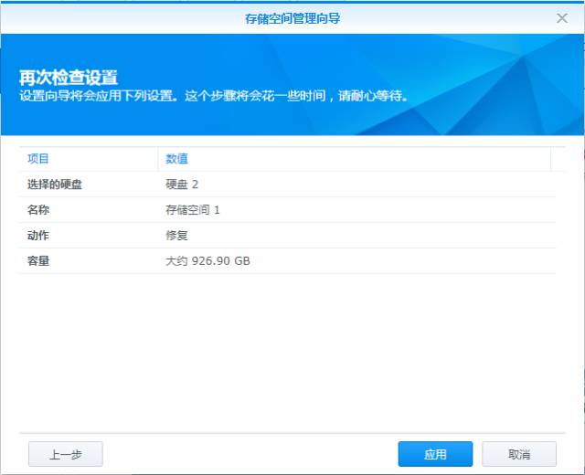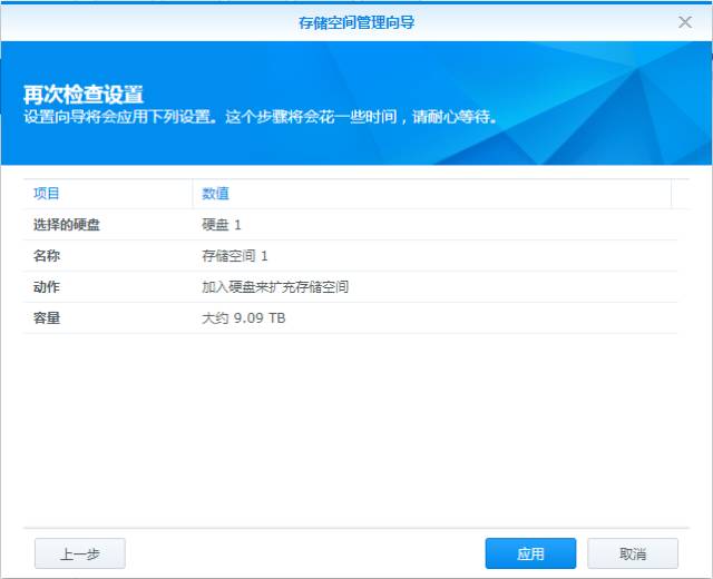 ⑧ 确认后点击“应用”。这个界面中的容量也就是通过添加硬盘后,在现有RAID模式下的可用容量(也可预先在官网模拟计算RAID容量https://www.synology.cn/zh-cn/support/RAID_calculator)