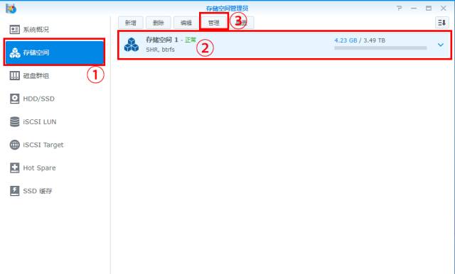 ④ 打开“存储空间管理员”>点击已设置的存储空间>点击“管理”