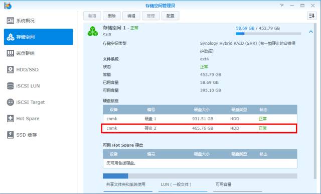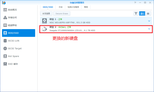 ⑤ 进入“存储空间管理员”>HDD/SSD,确认新硬盘被识别