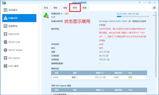⑥ 存储空间状态显示为“堪用”,选择“管理”