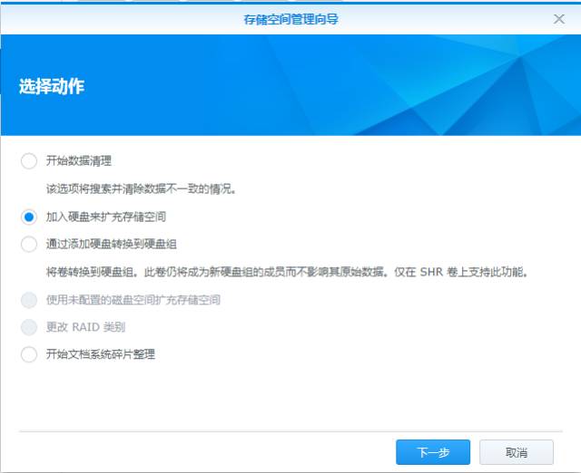 ⑤ 选择“加入硬盘来扩充存储空间”(如未设置RAID可选择“将硬盘添加到SHR卷”)